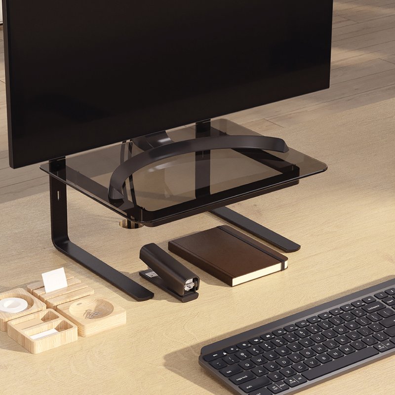 Suporte para Monitor Office Reliza com Vidro Fumê para uso sobre a Mesa. Organize sua mesa de trabalho.