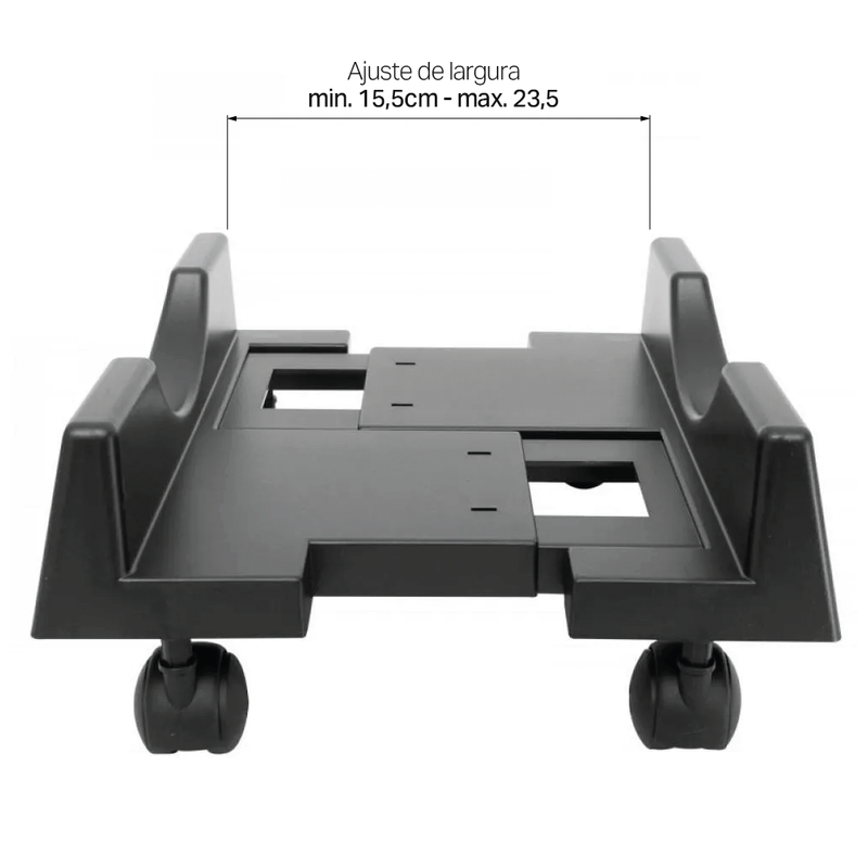 :: Ajuste de Largura: Possui um sistema de ajuste que gera um espaço interno variável de 15,5 cm a 23,5 cm, acomodando CPUs de diferentes tamanhos com segurança.